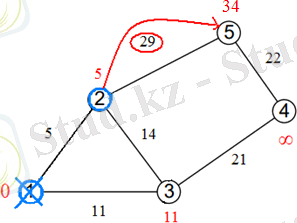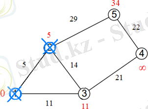2-ші шыңның тағы да бір көршісі ол - 5-ші шың. Оған дейінгі 2-ші шың арқылы жол 34-ге тең. Яғни 34< ∞, 34-ге тең болатын 5-ші шыңға белгілену енгіземіз (2. 10 сурет)