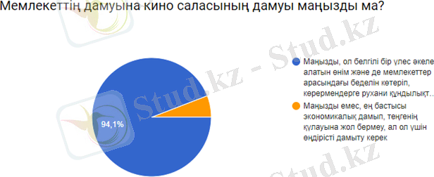 94, 1% адам киноның дамуын маңызды көрсе, қалған 5, 6%-і одан көрі Қазақстанның басқа мәселелеріне көңіл бөліп, маңызды емес деп санайтынын білдірді.