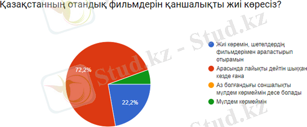 Алайда, Қазақстан фильмдерін маңызды деп санайтын адамдарға қарағанда оны көретін адамдар саны азырақ болды. Тек қана 22, 2 %-і ғана отандық фильмдерін үнемі шетелдік фильмдермен араластырып көріп отырса, 72, 2 %-і арасында лайықтысын ғана көреді. Қалған 5, 6 %-і мүлдем көрмейміз деді.