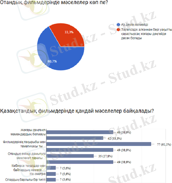 Қазақстан фильмінің көрермендері бойынша үштен екі бөлігі Қазақстан фильмдерінің мәселелері көп деп мойындаса, үштен бірі Қазақстан тәуелсіздік алған уақыттан бері қарастырсақ, жетістіктеріміз жоғары деңгейде деп санайды.