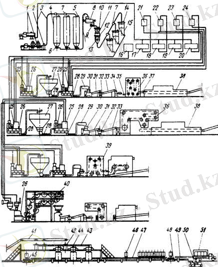 2-сурет:Нан-тоқаш өнімдерін өндірудің аппаратуралық-технологиялық схемасы: 1 - Шикізатты ыдыссыз тасымалдауға арналған автомуковоз және автокөлік; 2 - жалғау құрылғысы; 3 - Құбырлар; 4 - ұнды сақтауға арналған сүрлемдер; 5 - сүзгі; 6 - роторлы қоректендіргіш; 7 - ауыстырып қосқыштар; 8 - елеуіш; 9 - қоректендіргіш; 10 - сүзгі; 11 - аспалы бункер; 12-Автоматты порциялық таразы; 13- таразы астындағы бункер; 14 - сүзгі; 15-ұнға арналған өндірістік бункер; 16-суға арналған жинақ; 17 - тұз ерітіндісіне арналған жинақ; 18 - ашытқы сүтінің жинағы; 19 - қант ерітіндісіне арналған жинақ; 20-тұз ерітіндісіне арналған жинақ ; 21 - тұз ерітіндісіне арналған тұрақты деңгейдегі Бак; 22 - ашытқы сүтіне арналған тұрақты деңгейдегі Бак; 23 - қант ерітіндісіне арналған тұрақты деңгейдегі Бак; 24 - майға арналған тұрақты деңгейдегі Бак; 25 - мөлшерлеу станциясы; 26 - қамыр илеу машинасы; 27 - қамырдың ашытуына арналған бункер; 28 - жартылай фабрикаттың қалақты айдағышы; 29 - қамырды ашытуға арналған шұңқыр; 30 - қамыр бөлгіш; 31 - таспалы конвейер; 32 - қамыр илегіш; 33 - таспалы транспортер; 34 - орау машинасы; 35 - қамыр дайындамаларын конвейер-төсеуші; 36 - расстойный шкаф; 37 - ауыстырып салу конвейері; 38 - нан пісіру пеші; 39-пеш агрегаты; 40 - тізбекті ашыту агрегаты; 41 - нанға арналған конвейер; 42 - нанды бағдарлауға арналған құрылғы; 43 - ленталық конвейер; 44 - нан салу агрегаты; 45 - тиеу арбашығы; 46 - контейнер; 47 - тиелген контейнерлерді жинақтағыш; 48 - жинақтағыш арба; 49-тиеу конвейері; 50-автомобильді түйістіру тетігі; 51-автохлебовоз