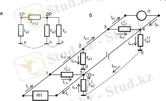 Сур. 1. 4. Рельс тізбегінің жеңілдетілген электр тізбегі режимі: a-ru1 және ru2-бірінші және екінші рельсті оқшаулау кедергісі балластың төменгі қабаты бойынша ағу токтары үшін жерге қатысты жіпшелер; ru12 − жоғарғы қабаты бойынша ағу токтары үшін оқшаулау кедергісі балласт қабаты (беттік ағу) ; Мо − тіректердің жерге тұйықтау кедергісі, 2р рельстік жіпке қосылған; Б-ИП-рельстік қоректену көзі тізбектер; П - жол қабылдағышы; іс − рельс желісінің басындағы сигналдық ток; I ҚР − Жол қабылдағышының тогы; Ii− j − рельс желісінің басындағы сигналдық токтар (i, j-электр тізбегінің тармақталу нүктелері 1 . . . 5) ; 0-жер (жердің кедергісі нөлге тең) ;