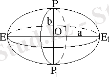 Осыған байланысты Р 1 ЕРЕ 1 эллипстiң РР 1 кiшi өсiнiң төңiрегiнде айналуынан пайда болған беттi жер эллипсоидының бетi немесе сфероид деп атайды (2. 1-сурет) . Жер эллипсоидының көлемi оның жарты өстерiнiң ұзындықтары a ( үлкен жарты өсi), b (кiшi жарты өсi) және Жердiң полярлық cығылу арқылы сипатталады.