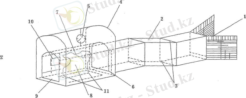 1 - шағын бөлімше, 2 - өткелек, 3 - бөлгіштер, 4 - негізгі (салмақ түсетін) рама; 5 - динамометр, 6 ‒ роликтер, 7 - жылжымалы рама; 8-11 - реттейтін төлкелер; 9 - тор; 10 - рама-перде.