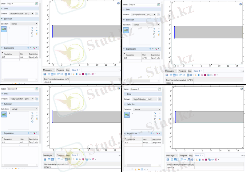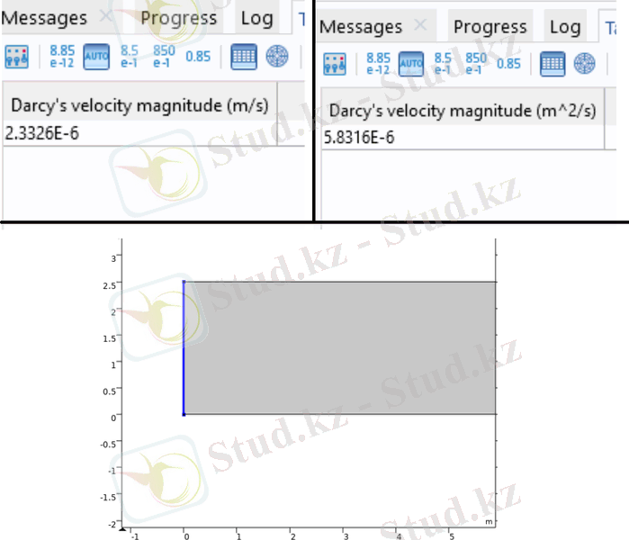 Есепте сұрап жатқан сұйықтың шығыны мен сүзілу жылдамдығын анықтау үшін derived values бөліміне кіріп, цилиндрдің шыға берісі жағынан беттік интеграл аламыз, сол кезде бізге есептің сұйықтың шығыны мен сүзілу жылдамдығының сандық мәндерін көрсетеді (Сурет 3) .