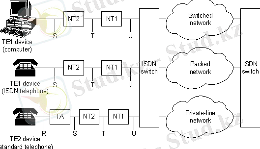 Integrated Services Digital Network (ISDN) желісінің атауы (интеграцияланған қызметтері бар сандық желі) соңғы пайдаланушыларға қол жетімді сандық қызметтер жиынтығын білдіреді. ISDN дауысты, пайдаланушыға қолда бар телефон сымдары арқылы ақпаратты, мәтінді, графикалық бейнелерді, музыканы, бейнесигналдарды және басқа да материалдық көздерді беру және бір терминалдан түпкі пайдаланушыны алу үшін телефон желісін цифрлауды көздейді. ISDN жақтаушылары цирк сигналын беруді және жаңа түрлі қызметтерді қоспағанда, Қазіргі телефон желісіне ұқсас әлемдік желінің суретін салады. ISDN-бұл абоненттік қызметтерді, пайдаланушы/желі интерфейстерін және желі мен брандмауэр функцияларын стандарттау әрекеті. Абоненттік қызметтерді стандарттау-бұл халықаралық деңгейде үйлесімділік деңгейіне кепілдік беру әрекеті. Интерфейсті стандарттау пайдаланушысы / желісі үшінші қатысушы болып табылатын өндірушілердің осы интерфейстерінің нарықта дамуы мен өткізілуін ынталандырады. Желілік және желіаралық мүмкіндіктерді стандарттау ISDN желілерінің бір-бірімен байланысының жеңілдігін қамтамасыз ету арқылы әлемдік ауқымда интеграция мүмкіндігі туралы мақсатқа жетуге көмектеседі. ISDN қосымшаларына жылдам жұмыс істейтін кескіндерді өңдеу жүйелері (мысалы, Group 1V факсимилі), қашықтан қол жеткізу индустриясына қызмет көрсететін үйлердегі қосымша телефон желілері, жоғары жылдамдықты файлдарды жіберу және бейнеконференциялар кіреді. Дауыс беру ISDN үшін танымал қолданбалы бағдарлама болады. Көптеген коммерциялық байланыс желілері ISDN-ді тарифтен төмен бағамен ұсына бастайды. Солтүстік Америкада жергілікті желі коммутаторымен (local-exchange carrier) (LEC) коммерциялық байланыс желілері ISDN қызметтерін қазіргі уақытта "ғаламдық телефон қызметі" (WATS) (wide-area telephone service) қызметтерінің көп бөлігін орындайтын T1 қосылыстарына балама ретінде ұсына бастады. ISDN компоненттерінің қатарына терминалдар, терминал адаптерлері (ta), желіні аяқтау құрылғылары, желіні аяқтау жабдықтары және коммутацияны аяқтау жабдықтары жатады. ISDN терминалдарының екі түрі бар. ISDN мамандандырылған терминалдары" 1 типті терминалды жабдық " (terminal equipment type 1) (TE1) деп аталады. ISDN стандарттарына дейін жасалған DTE сияқты ISDN үшін әзірленбеген терминалдар "2 типті терминал жабдығы" (terminal equipment type 2) (TE2) деп аталады. TE1 терминалдары ISDN желісіне төрт бұралған жұп сымдардан тұратын сандық байланыс желісі арқылы қосылады. TE2 терминалдары ISDN желісіне терминал адаптері арқылы қосылады. ISDN (ta) терминал адаптері автономды құрылғы немесе T E 2-де болуы мүмкін. Егер 2 автономды құрылғы ретінде жүзеге асырылса, онда ол стандартты физикалық қабат интерфейсі арқылы ta-ға қосылады (мысалы, EIA232, V. 24 немесе V. 35) . ТЕ1 және ТЕ2 құрылғыларынан тыс орналасқан ISDN желісіндегі келесі байланыс нүктесі-NT1 немесе NT2. Бұл төрт сымды абоненттік қондырғыны екі сымды жергілікті желінің дәстүрлі тізбегіне қосатын желіні аяқтау құрылғысы. Nt1 құрылғысы" Тапсырыс берушінің сәлемдемелері " (customer premises equipment) (CPE) Солтүстік Америкада болып табылады. Nt1 жарықтандырудың көптеген басқа бөліктері коммерциялық байланыс желілері ұсынатын желінің бөлігі болып табылады. NT2 - бұл" жалпы желіге кіретін жеке сандық телефон станцияларында " (PBX) және 2-де жиі қолданылатын күрделі құрылғы 3 деңгейлі хаттамалар мен деректерді шоғырландыру функцияларын орындайды. Сондай-ақ, nt1/2 құры