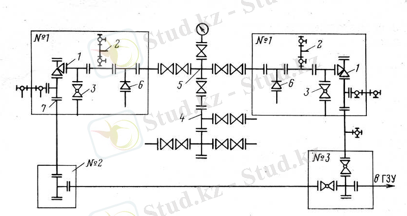 5-суретте заводтық жинаудың стандартты түйіндер көрсетілген. Олар төртбұрыш болып, номерлермен (№1, №2, №3) белгіленген. Сұлбада екі реттелетін штуцер, екі вентиль сұйықты жəне газды алу үшін, өнімді факелге лақтыру үшін жабу құрылғылары 3 немесе жер амбары, тройник 4, крестовик 5, сақтандыру клапаны 6, фланецті қосылыс 7 қарастырылған. Манифольдтың негізгі түйіндері фонтанды арматураның бөлшектерімен бір түрге келтірілген. Манифольдтың ұшында 80 мм диаметрлі құбырмен жалғасу үшін фланецтер болады. Манифольдтың белгіленуіне сұлба нөмірі, шартты өту диаметрі жəне жұмыс қысымы, мысалы 1 МАТ-60х125 кіреді. Шығарынды шлейф манифольд арматурасын мұнай газ жинау жүйесінің топтық өлшеу қондырғысымен (ТӨҚ) байланыстырады, мұнда автоматты түрде ұңғы шығымы өлшенеді. ТӨҚ-на ұңғымалар тобы (24 дейін) қосылады, олардың шығымы белгілі бағдарлама бойынша кезегімен өзгеріп отырады.