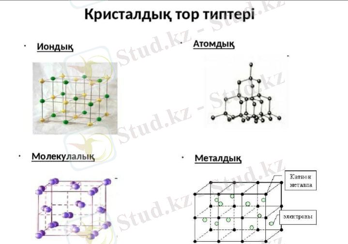 Көптеген қатты заттар кристалдық құрылысты болады(тұз, қант) мұндай заттарды кристалдық заттар деп атайды. Кристалдарда, атомдар, молекулалар белгілі ретпен орналасады, осындай аралықта кезектесіп келетін бөлшектер Кристалдық тор түйінділері деп атайды. Кристалдық торлар: