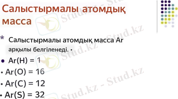 Салыстырмалы атомдық масса дегеніміз атом массасының 1 м. а. б-нен неше рет үлкендігін көрсететің сан. Бұны Ar деп белгілейді. Көміртегі атомының салыстырмалы атомдық массасы 12 м. а. б-ге тең, ал сутегінің 1 м. а. б-ге тең. Басқалай айтсақ салыстырмалы атомдық масса, атомның массасының көміртегі массасының 1/12 бөлігінен неше рет үлкендігін көрсететің сан. Химиялық элементтер атомдарының салыстырмалы атомдық массалары Менделлевтің кестесінде көрсетілген.