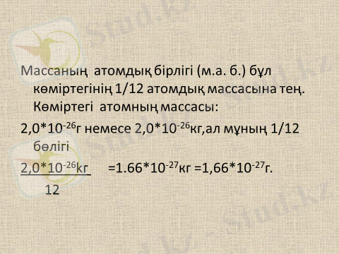 Атомдық масса - атомдық салмақ-химиялық элемент атомы массасының салыстырмалы бірлікпен көрсетілген орташа мәні.