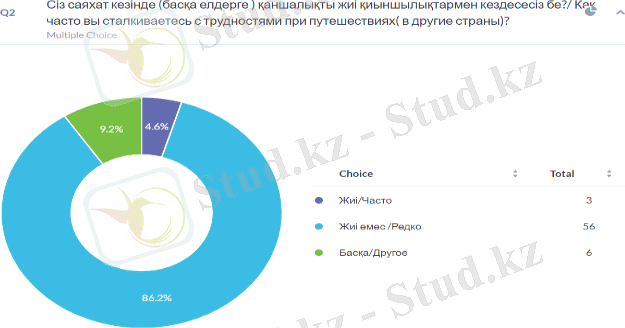 Келесі сұраққа жауап берушілердің 86% шетелдік мемлекеттерге саяхат жасау кезінде қиыншылықтармен сирек кездеседі. Респонденттердің басқа елдерге 9% саяхаттамайды. Бұл ақпарат алдыңғы сұрақтардан алынған мәліметтермен салыстырғанда, ішкі туризмнің басым болуынан сондай жағдай пайда болды. Яғни адамдар шетелдік мемлекеттерге сирек саяхаттауғандықтан сирек қиыншылықтармен кездеседі. Алайда, шетелге жиірек саяхаттайтын адамдар барлығы сирек қиыншылықтармен кездеседі деп жауап берді. Бұл басқа елдермен дамыған қарым-қатынастар баршылық дәлелдейді. Жалпы құрылған жағдайы экономикалық диму идикаторлармен сәйкес келеді. Сондықтан сауланама арқылы қазіргі Қазақстан экономикасының жағдайы орташа деңгейде.