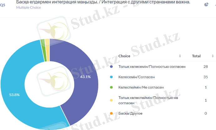 Екінші зерттеу сұраққа қатысты деректерден алынған ақпарат сауланаманың нәтижелермен ұқсас. Жалпы бұл сұрақ Жауап берушілердің 97% басқа елдермен интеграция маңыздылығын туралы айтады. Бұл экономиканың дамуына геосаясаттын маңызды рөлін дәлелдейді. Сонымен қатар алдыңғы сұрақтар бойынша бірнеше қорытындылар жасауға болады, себебі экономикалық даму индикаторлары мемлекетпен өткізетін саясатың саладары ретінде қарыстыруға болады. Яғни сондай көрсеткіштер жету үшін арнайы іс-шаралар жасау қажет. Сауланама арқылы дәлелдеген Қазақстандағы экспорт және импорттың жоғары деңгейі басқа елдермен интеграция арқылы пайда болды. Сондай-ақ шетелге саяхаттау кезінде адамдар қиыншылықтармен елдермен сирек кездесуі оргатылған қарым-қатынастар арқылы жүзеге асырылды. Сондықтан Қазақстан экономикасының дамуында геосаясат үлкен рөлін атқарады. Бұл негізгі бөліміде аңықталған қорытындысымен сәйкес келеді.