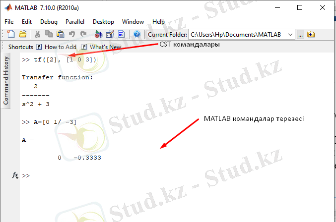 CST-мен жұмыс жасау үшін, MATLAB бағдарламасын іске қосу қажет және одан кейін, MATLAB ортасының командалар терезесімен (1. 1 - сурет), зертханалық жұмыста келтірілген командалар жинағын жұмыс жасау керек.