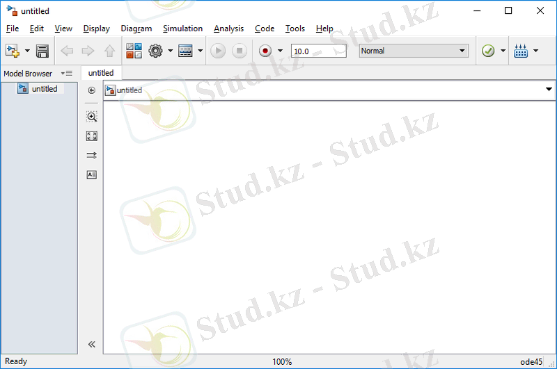 MATLAB Simulink-пен жұмыс істеу үшін, MATLAB бағдарламасын іске қосқаннан кейін мәзірден File→New→Model деп ашу қажет. Ашылған терезеде (1. 2 - сурет) Simulink кітапханасының операционды блоктарынан жүйенің моделі жинақталады.