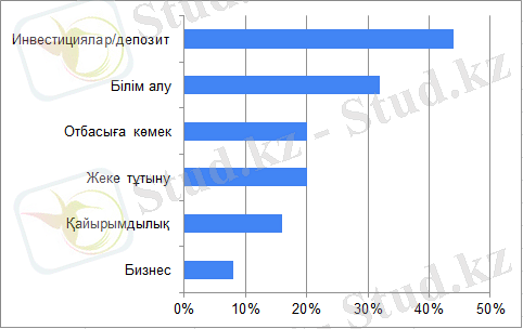 Жауаптардың әрқайсысы қатысушы жасағысы келетін шығындар санатын анықталды. Барлығы 6 санат болып шықты: инвестициялар, білім алу, отбасыға көмек, жеке тұтыну, қайырымдылық пен бизнес (2 сур. қараңыз) . Болжамды санаттар - саяхат, ойын-сауық - сауалнама жауаптарында көрінбеді. Санаттардың атап өту жиілігін талдау қоғамдағы жарнамалардың әсерін және тұтынуға деген ұмтылысты анықтауға көмектеседі.