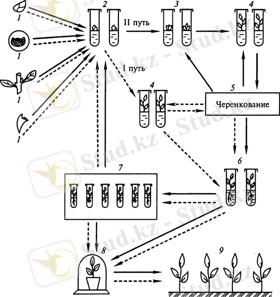1 - Бастапқы эксплантты таңдау; 2 - стерильді дақыл алу; 3 - тікелей бастапқы эксплантта адвентивті бүршіктердің пайда болуы; 4 - бүйректің өсуі және микропобегтердің пайда болуы; 5 - микропобегтердің көбеюі (кесу) ; 7 - төмен температурада регенерант өсімдіктерін сақтау; 8-өсімдіктерді жылыжай жағдайларына ауыстыру; 9 - регенерант өсімдіктерін отырғызу топырақ.