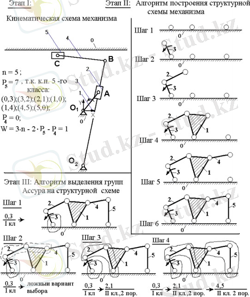 - Алынған құрылымдық диаграммада құрылымдық топтар (Assur топтары) 1. 1-суретте көрсетілген алгоритмге сәйкес анықталады. (III кезең) .