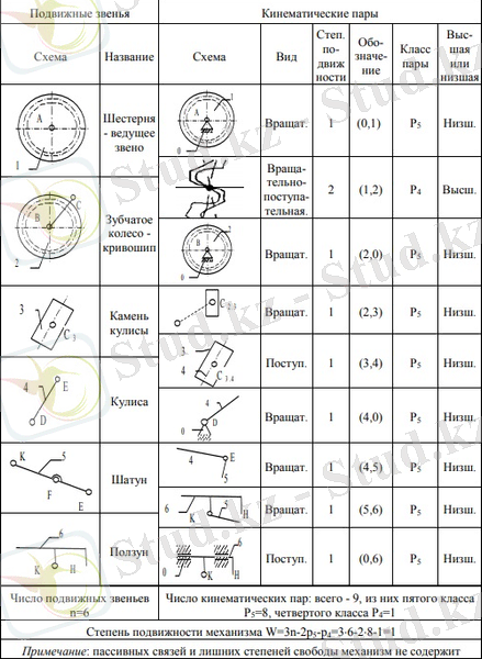 - кинематикалық жұптардың санын анықтаңыз (к. п. ) және олардың сипаттамаларын беріңіз (мысалы: - (0, 1) - айналмалы төменгі кинематикалық 5-ші жұп, (1, 2) - 5-ші кластың төменгі кинематикалық жұбы және т. с. с. КП бейнелейтін жақшалар 1. 1-суретте көрсетілген (I кезең) ) ; 5-ші кластың кинематикалық жұптарының санын (Р5 = 7) және одан жоғары ПӘК санын есептеңіз. 4-сынып (P4 = 0) ;