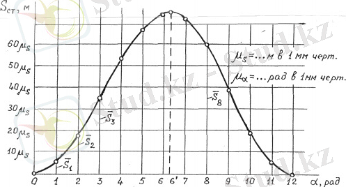 Ординаталардың ұштары радиусы 2 - 3 мм шеңберлермен белгіленеді, ал әрбір шеңбердің центрі сәйкес ординатаның соңында орналасқан. Ординаталардың ұштары арқылы шеңберлерді сызбай, өрнектер көмегімен тегіс қисық сызылады, ол қажетті график болып табылады. Ордината осі бойымен масштабты бөлуді әр 10 немесе 20 мм сайын кейінге қалдыру керек және мысалы, шығу нүктесінен 10 мм өткеннен кейін S мәні 10 S′(α), 20 мм-ден кейін 20S-ге тең және т. б. . д. графиктің жоғарғы жағына S′(α) = 0, 002м / мм үшін бізде сәйкесінше 0, 02 мәндері болады; 0, 04 және т. б. (метрмен) .