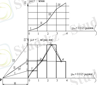 Содан кейін S′(α) графигінің абсциссасының жалғасында P нүктесін - басынан H = 40 мм қашықтықта дифференциалдау полюсін таңдап, I, II сәулелерін салыңыз. Сәйкес аккордтарға параллель, S′(α) графигінің ордината осімен қиылысқанға дейін III және т. б. Алынған 1, 2, 3 нүктелері арқылы және т. б. абсцисса осіне параллель түзулер жүргізіп, аргументтің сәйкес бөліміне өзгерт (мысалы, I хорда үшін 0 - 1; IV хорда үшін 3 - 4) график
