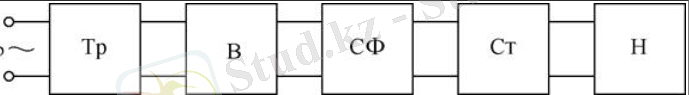 Оған мыналар кіреді: түзеткіштің шығысындағы кернеудің қажетті мөлшеріне сәйкес желіден алынған айнымалы кернеудің мөлшерін өзгертетін Тр - трансформатор; В - бір немесе бірнеше клапандардан (диодтардан) тұратын түзеткіш; СФ - түзетілген кернеудің пульсациясын төмендететін тегістейтін сүзгі; Ст - жүктеме құрылғысындағы тұрақты кернеуді қолдайтын тұрақтандырғыш; Н - жүктеме құрылғысы (мысалы, жүктеме резисторы) .