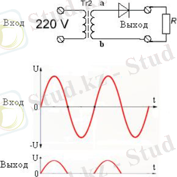 Оң жарты толқын болған кезде, А плюс нүктесінде, В минус нүктесінде диод ашық және жүктеме арқылы ток өтеді. Теріс жартылай толқынмен, қосу Внүктесінде, ал Анүктесінде минус. Диод жабық, жүктеме арқылы ток ағып кетпейді.