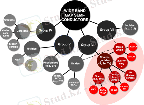 IV топтағы аниондармен (мысалы, графен [10], және көміртекті нанотүтікшелер [12], SiC [13] ), V (мысалы, GaN [14, 15], мырыш нитридтері [16] ) және VII аниондары бар кең зоналы жартылай өткізгіштерде айтарлықтай зерттеулер жүргізілді. Осы материал кластарының желілік диаграммасы 1. 1-суретте [18] бейнеленген, халькогенидтер қызыл түспен көрсетілген. Көптеген шолу мақалалары мен кітап тараулары кең зоналы жартылай өткізгіштерінің осы саласының әр түрлі аспектілерін қарастырады. Кейбіреулер ішкі материалдың қасиеттеріне назар аудара отырып, оксидті ТСО-ны зерттейді [19, 20], ал басқалары мөлдір электроника [21] және фотоэлектрика сияқты қосымшаларға назар аударады [17] . Басқалары нитридтер [22], галогенидтер [23], және карбидтер [24], графенді қосады [25] . Бірнеше шолуларда кең зонадағы жартылай өткізгіштер туралы қысқаша айтылған, бірақ олардың фокустары оксидтермен немесе халькогенидтердің тар жиынтығымен шектеледі [26] .