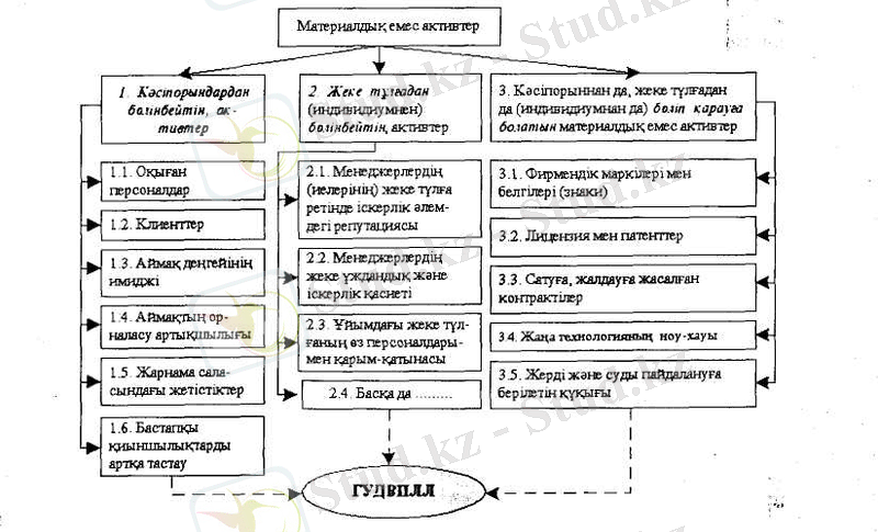 4. Материалдық емес активтердің басқа да түрлері. Материалдық емес активтердің бұл тобына «Фирма бағасы» («гудвилл»), интеллектуалдық меншік және тағы басқалары кіреді ("гудвилл" құрамьна кіретін материалдық емес активтер) .