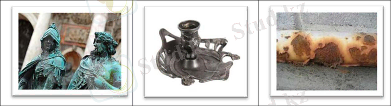 - Уақыт өте келе мыстан жасалған бұйымдарда жасыл дақтың пайда болуы, ал күмістен жасалған бұйымдардың қараюы мен темірдің тоттануына әсер еткен факторларды атаңыз.