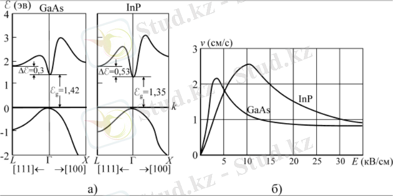 1. 3-сурет. GaAs және InP үшін (a) E энергиясының k толқындық векторына және v электрондар жылдамдығының Е өріс кернеулілігіне тәуелділігі