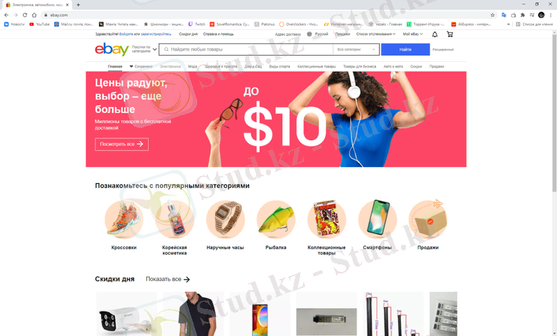 https://www. ebay. com/ Бұл интернет-дүкен Интернеттегі тауарлар мен қызметтерді сатуға арналған, осы интернет-дүкенде тауарларды бүкіл әлемнің адамдары мен компаниялары сатады, бірақ олардың көпшілігі Америка Құрама Штаттарының тұрғындары. Келесі бөлімдер бар: негізгі бөлімде жаңа және ұсынылған өнімдер бар, мысалы тауарлар санатына көшу: электроника, сән, сұлулық және денсаулық. Сонымен қатар басқа ресурстарға сілтеме бар; бұған қосымша сайтта сайт туралы ақпарат, байланыс деректері, төлем әдістері және сатып алушы талап ететін барлық қажетті қосымша ақпарат бар; әр каталог пайдаланушыларға навигация мен қажетті өнімді іздеуде ыңғайлы болу үшін кіші санаттарды қамтиды; тіркеуге сілтемелер, әзірлеушілер туралы, сайт картасы және басқалары парақтың төменгі колонтитулында орналасқан, яғни. төменгі бөлігінде. Бұл интернет-дүкен 1995 жылы 4 қыркүйекте Калифорния штатындағы Сан-Хосе қаласында жасалған, бағдарламашы Пьер Омидьяр өзінің жеке веб-сайтының бір бөлігі ретінде AuctionWeb атты онлайн аукцион құрды(1-сурет) .