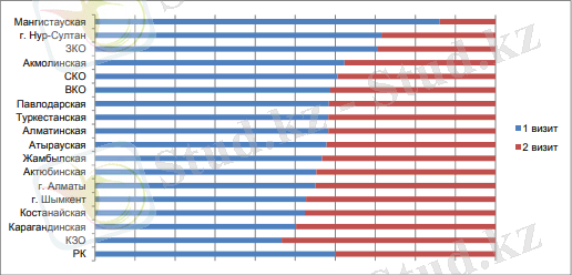 1-диаграмманың деректері бойынша АГ қатысатын пациенттердің жалпы санынан АББ 2-ші тексеріліс республика бойынша орташа есеппен пациенттердің 66, 6 прц қамтылды, ал 2-ші тексерістің, МСАК мамандарына жүйелі түрде бармауының ең төменгі пайызы 50 прц кем 3 өңірде анықталған( Маңғыстау 16 прц, Нұрсұлтан 40 прц, БҚО 2 прц) .