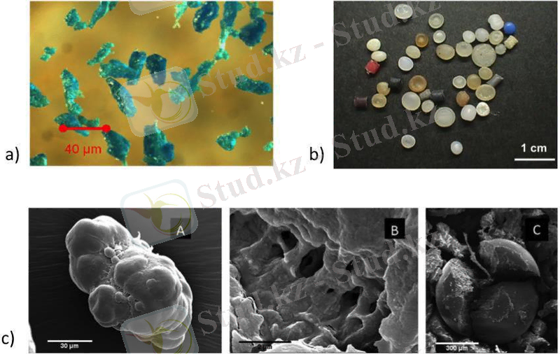 1. 2-сурет Біріншілік микропластика: а) тіс пастасынан жасалған абразивті микропластика; б) құрлықта жиналған пластикалық түйіршіктер; в) Бет скрабынан алынған пластикалық микробүршіктердің электронды микроскопиялық суреттері.