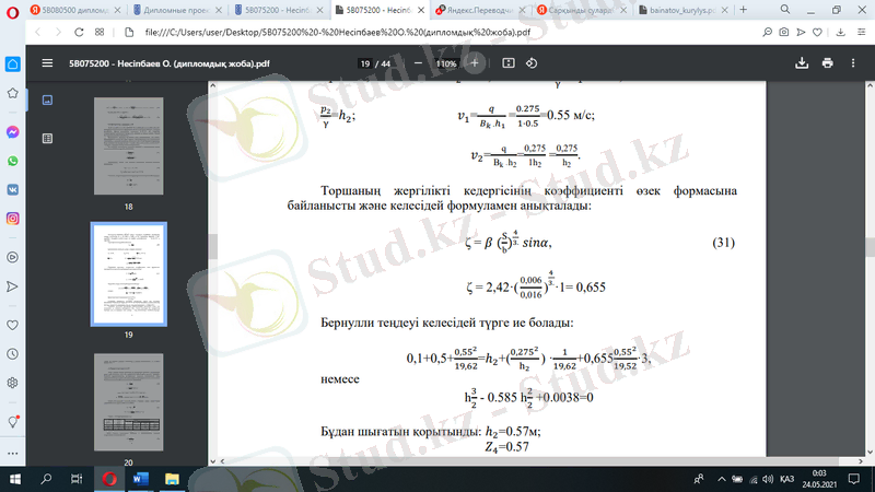 In the second part, we calculated the technological structure of wastewater treatment facilities in the village of Kazakhstan. The third economic section considers the calculation of annual operating costs and the payback period, the profitability of the project.