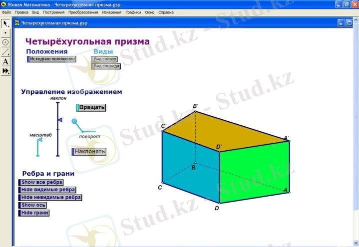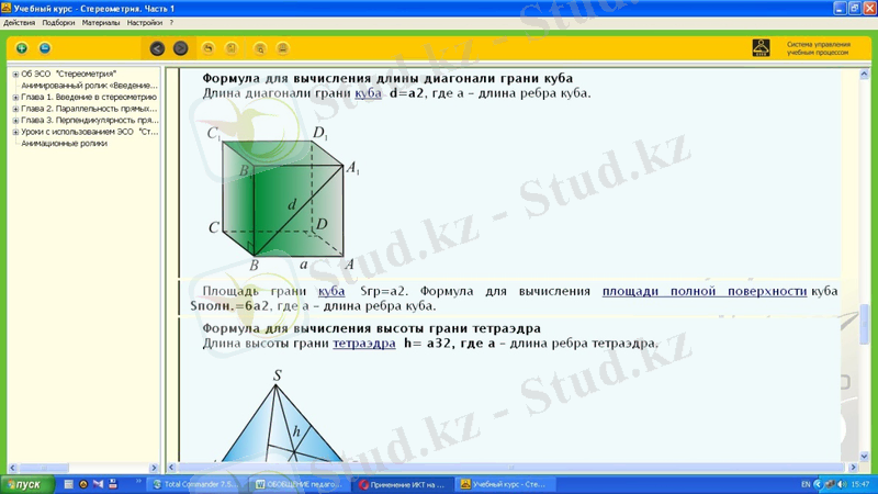 Математика сабағында АКТ-ны қолдану жұмыстың анықтығы мен жылдамдығына байланысты материалды оқу уақытын қысқартуға, оқушылардың білімін интерактивті режимде тексеруге мүмкіндік береді, бұл оқытудың тиімділігін арттырады. Осы мақсатта геометрия сабағында мен «Тірі математика» және «Тірі геометрия» оқу-әдістемелік жинақтарын жиі қолданамын.