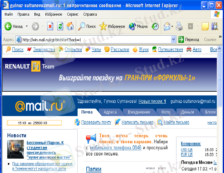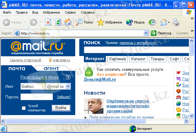 2) Шыққан сұхбаттық терезенің адрес бөлімінде мына қатарларды теріңіз: http://www. mail. ru және Enter батырмасын басыңыз;