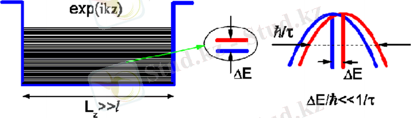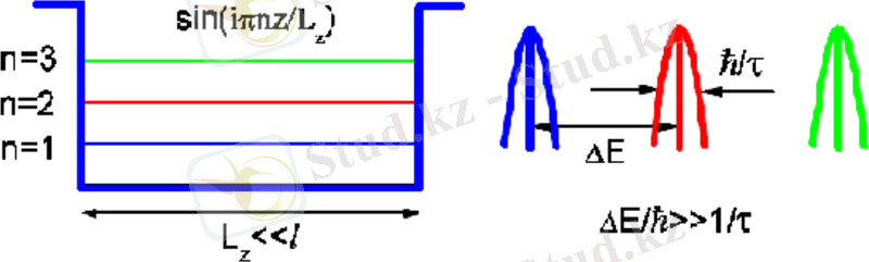 Алайда бұл дискреттіліктің өзіне тән масштабы, яғни көршілес ΔE күйлердің арасындағы энергетикалық арақашықтық, осы күйлердің τ теріс өмір уақытымен анықталатын спектрлік енімен салыстырғанда кіші. Бұл мағынада көлемді материалдың өзіндік қозуларының үздіксіз энергетикалық спектрі туралы айтуға болады. Сонымен қатар, көлемді материалды L z өлшемі өзінің қозуларының l дербес қашықтығынан үлкен етіп сипаттауға болады. Дербес қашықтық ұзындығын сипаттаушы масштаб ретінде енгізу түсіндірулі, себебі өзіндік қозулар exp(ikz) қума толқындарымен сипатталуы мүмкін. Егер материал өлшемі кішірейіп, дербес қашықтық ұзындығынан төмен болса (Сурет 2), толығырақ айтсақ, көршілес күйлер арасындағы энергетикалық саңылау олардың теріс өмір уақытынан асып кетсе, қарапайым қозулардың энергетикалық спектрі дисктретті деп есептелуі тиіс. Жоғарыда айтылған құбылыс өлшемдік квантталу құбылысы болып табылады, ал сәйкесінше құрылымдар кванттық-өлшемдік деп аталады. Бұл жағдайда ағынсыз толқын түріндегі қарапайым қозудың материал шекарасынан шағылуы өте маңызды [4, p. 15] .