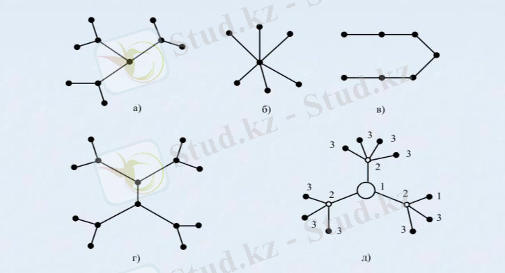 а - ағаш; б - жұлдыз; в - желілік (шина) ; г - қар; д - түйінді иерархиясы бар түйінді