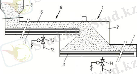 1-резервуар; 2-жоғарғы камера; 3, 11-псевдостенка; 5, 12-ауа жыберетін труба; 6, 7шығысындағы түтікше; 8-қоректендіруші танк; 13, 14-селеноидты клапан; 9-псевдоканал.