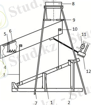 4 - алдынғы тіреу; 1 - артқы тіреу; 10 - рессор; 11 - виброжелоб; 13 - стержндар; 14 - реттеуіш пластина; 6 - рама; 17 - дозатор бункер-і; 18 - материалды беру механизмі; 19- кронштейн; 16 - жиілік өзгерткіш; 15 - қозғалтқыш (үш фазалы сызықты асинхронды) .