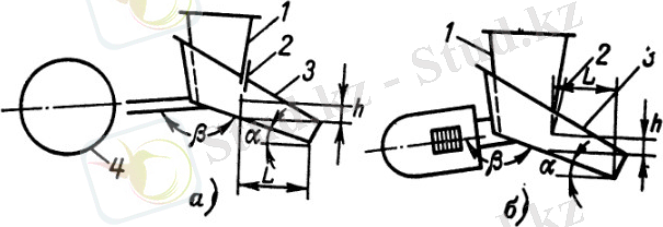 а - тербеліс бағытын беретін привод арқылы істейтін дозатор; б - вибропитатель; 1 - варонка; 2 - засалонка; 3 - лоток (қалақша) ; привод.