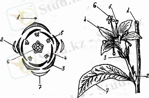 1 - с у р е т. Гүлдін құрылысы меи диаграммасы: 1 - гүлдің өсі - сабақ; 2 - гүл жапырақшалары; 3 - тостағанша жапырақшалары; 4 - күлте жапырақ-шалары; 5 - аталық; 6 - аналық; 7 - гүл жапырақ (жабын жапырақ) .