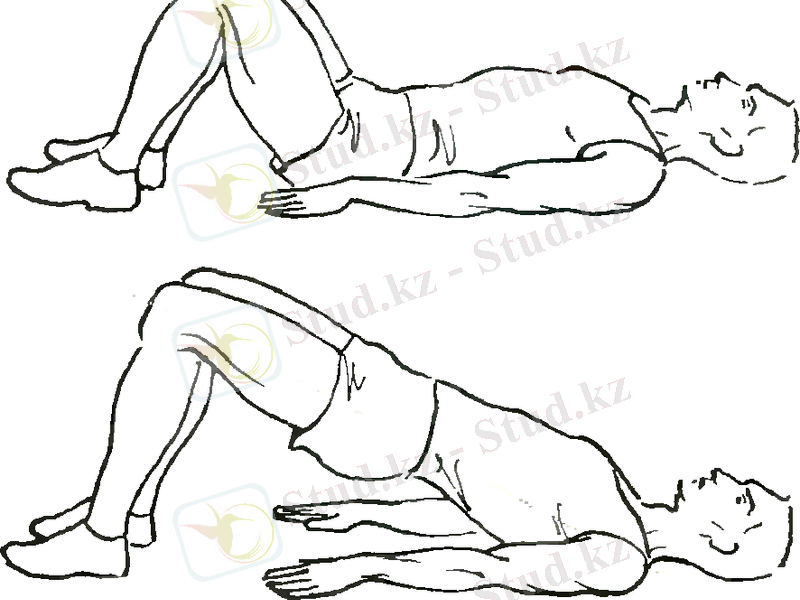 1. Бастапқы қалып: шалқаңыздан жатыңыз. Аяқты бүгіп, қолды созып жатасыз. Содан соң жамбасты жай қимылмен жоғары қарай көтересіз. Осы қалыпта да біраз тұрыңыз. Жаттығу барысында арқаға күш түсуі керек. Жаттығуды аяқтап, бастапқы қалыпқа келесіз. 6-7 рет қайталаған дұрыс.