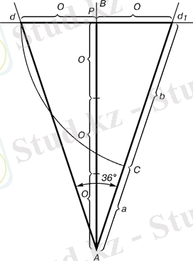 АВ түзуін жүргіземіз. А нүктесінен үш рет О кесіндісін кез-келген шамамен түсіреміз, сол алынған Р нүктесінен АВ түзуіне перпендикуляр жүргіземіз. Алынған d және d 1 нүктелерін А нүктесімен түзу қосамыз. Dd 1 кесіндісінен Аd 1 түзуін жүргізе отырып, қиылысатын С нүктесін аламыз. Ол Аd 1 түзуін алтын қима қатынасында бөлді. Аd 1 және dd 1 түзулерінен алтын тікбұрыш пайда болды.