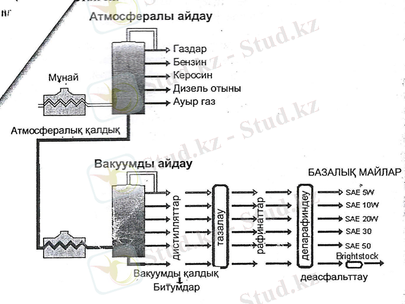 Базалық майлар. Мұнай майларын әртүрлі мақсатында алу негізі- мұнайдың атмосфералық айдаудың қалдығы - мазут. Май фракцияларын вакуумды айдау қондырғыларда алады. Қандайда болмасын майлардың өндіруі 3 кезеңнен тұрады: