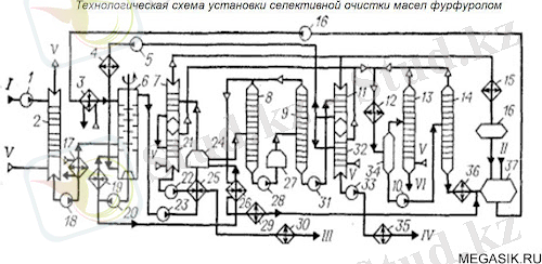 Технологиялыц жүйе (1-сурет) . Май фракциясы (1) шикізат сорабымен (2) деаэраторға беріледі, онда май су буы әсерімен еріген ауадан арылады. Деаэратордан (2) тоңазытқыш (17) арқылы май (6) дөңгелек контактордың орта бөлігіне бағытталады. Жоғары жағынан (3) қыздырғышта қыздырылған фурфурол енгізіледі. Контактордың төменгі бөлігінде экстрактталған ерітінді бөлінеді. Мұнда экстракттан (6) контактордың төменгі бөлігінің температурасы төмендеуіне және еріткіштен арылған экстрактты (11) колоннадан ендіру нәтижесінде, екінші рафинат бөлінеді. Контактордың (6) жоғары бөлігінен рафинат ерітіндісі (23) сораппен (25) жылу алмастырғыш және (24) пеш арқылы колонналарға (7 және 21) бірінен соң біріне еріткішті буландыруға береді.