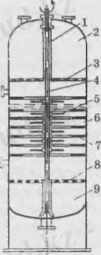 1-білік қабаты; 2, 9-жоғарғы және төменгі тұндырушы аппараттар; 3, 8-торлы табақшалар; 4-ротор білігі; 5-роторлы дискілер; 6-корпус; 7-статорлы