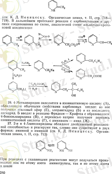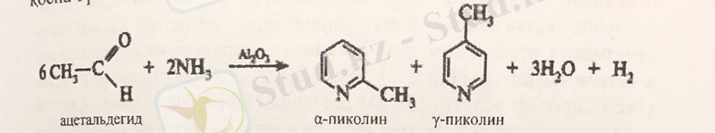 400°С - да катализатордың қатысында сірке альдегиді және аммиактан 2- және 4- метилпиридиндерден тұратын қоспа түзіледі.