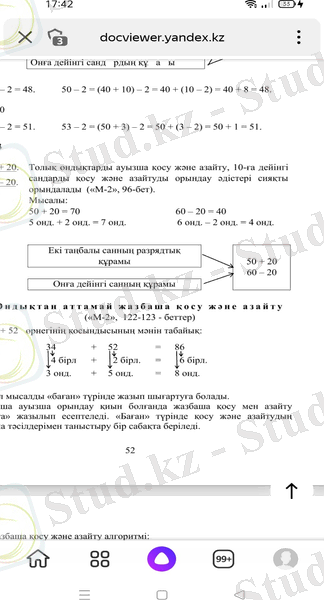 34 + 52 1. Бірінші қосылғышты (34) оның астына екінші қосылғышты (52) бірліктін астына бірлік, ондықтың астына ондық келетіндей жазамыз :