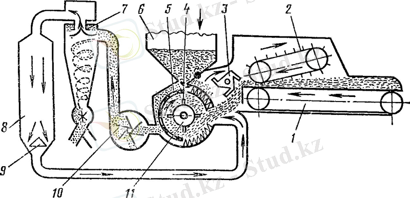 1 - көлденең тасымалдағыш, 2 - тығыздағыш көлбеу тасымалдағыш, 3 - кескіш барабан, 4 - магнитті сепаратор, 5 - жармалау камерасы, 6 - шанақ, 7 - циклон, 8 - сүзгіш жең, 9 - тосқауыл, 10 - желдеткіш, 11 - ұсақтағыш